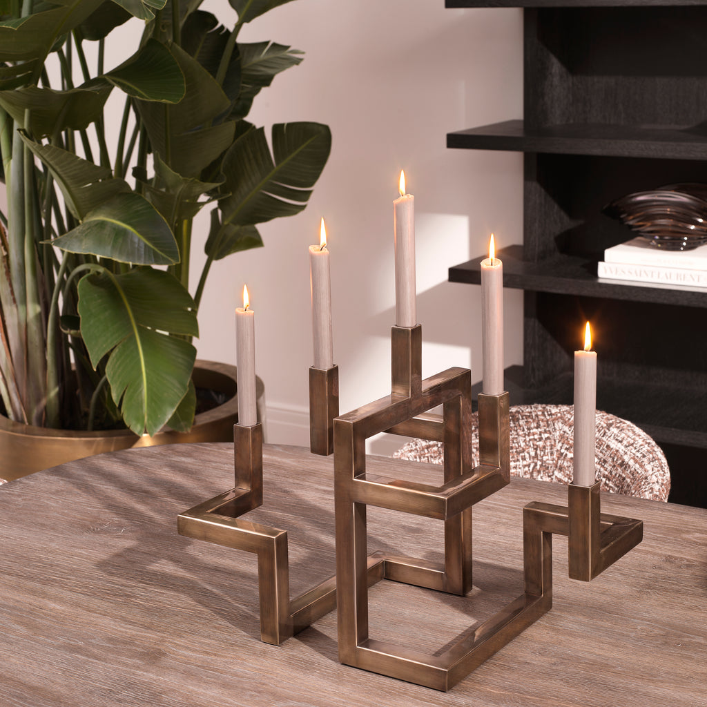 Realce su espacio vital con el icónico candelabro Skyline de Eichholtz. Este exclusivo candelabro con acabado en latón vintage ejemplifica una artesanía superior y un diseño atemporal, ideal para interiores contemporáneos. Aporta un toque sofisticado a cualquier ambiente, iluminando su espacio con elegancia y encanto.