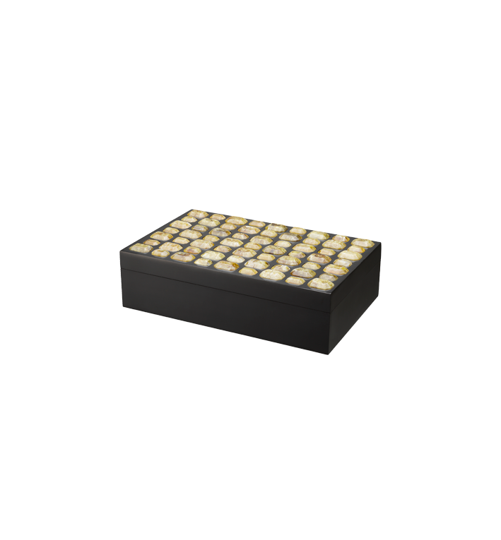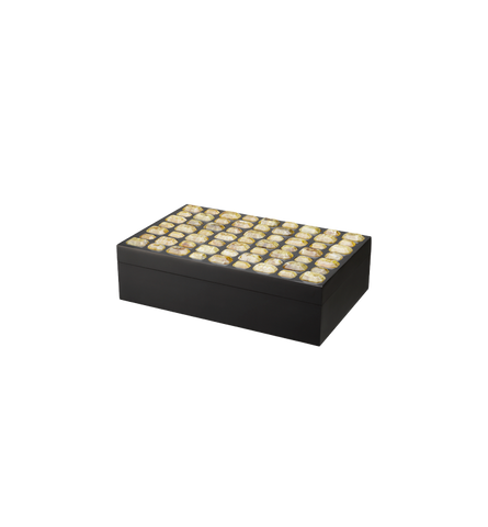 Añade un toque de amarillo con la caja Lucida L. Esta elegante caja, coronada con llamativas piedras de imitación de ámbar, presenta una refinada base negra, cuyo vibrante contraste se ve realzado por la tapa. Combina lujo y practicidad, convirtiéndose en la pieza perfecta para guardar pequeños tesoros o como un elemento decorativo único en cualquier habitación.
