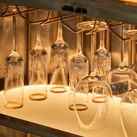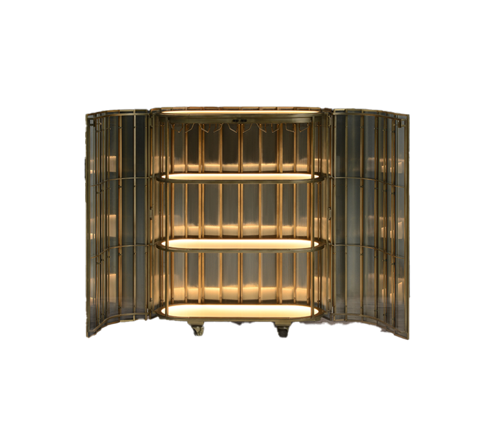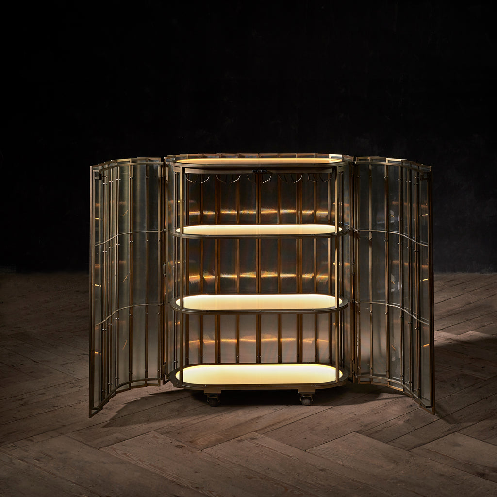 La hora del cóctel se convierte en una hora dorada con el hermoso mueble bar Shimmer y su suave brillo dorado. Shimmer, que irradia elegancia y delicadeza, está elaborado a mano con una serie de paneles de vidrio superpuestos, cada uno con bordes completamente de latón. El vidrio está sutilmente facetado, refractando la luz en el interior del mueble, creando un espectáculo de formas que embelesa la vista. Las puertas estilo mariposa se abren completamente, permitiendo un fácil acceso a sus bebidas y vasos, mientras que los tres estantes de vidrio iluminados albergan todo lo necesario para una noche inolvidable.