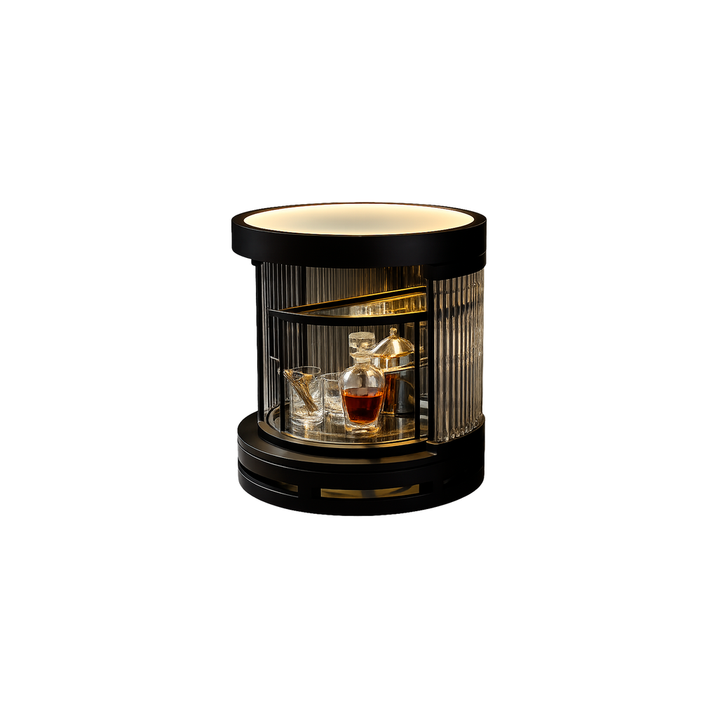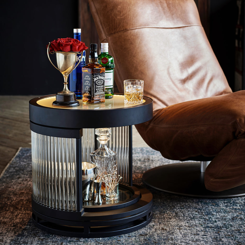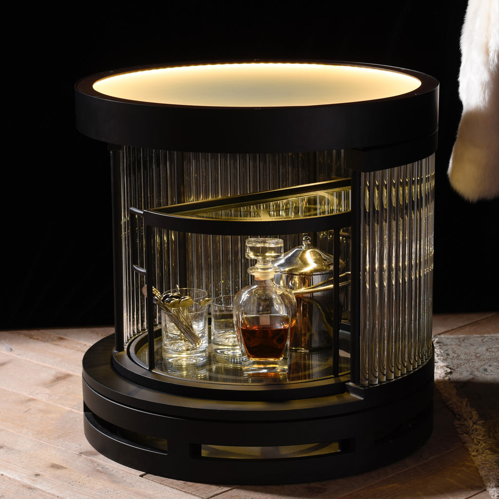 Una versión más pequeña de nuestro mueble bar Bio Hazard, que también sirve como mesa auxiliar. El nombre, irónicamente llamado Bio Hazard, es una advertencia en sí misma, pero esta hermosa cápsula luminosa de varillas de vidrio hechas a mano resulta tentadora. Enmarcada en negro, con iluminación LED integrada en la parte superior, sus puertas corredizas redondas revelan un interior protegido, ideal para guardar las botellas de la bebida favorita de tus invitados.