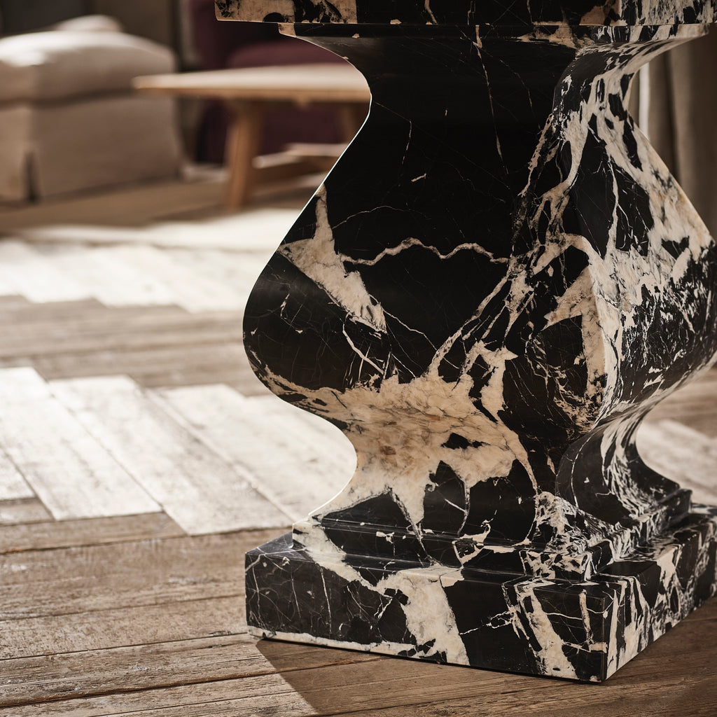 Con una base arquitectónica audaz, la elegante mesa de comedor Pedestal está tallada en nuestros mármoles más exóticos y espectaculares. Sus contornos esculpidos captan la luz, acentuando los dramáticos colores, patrones y contrastes de la piedra natural. No hay dos piezas iguales, ni en tamaño ni en marcas, lo que celebra la singularidad del mármol natural.