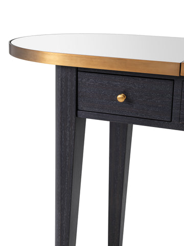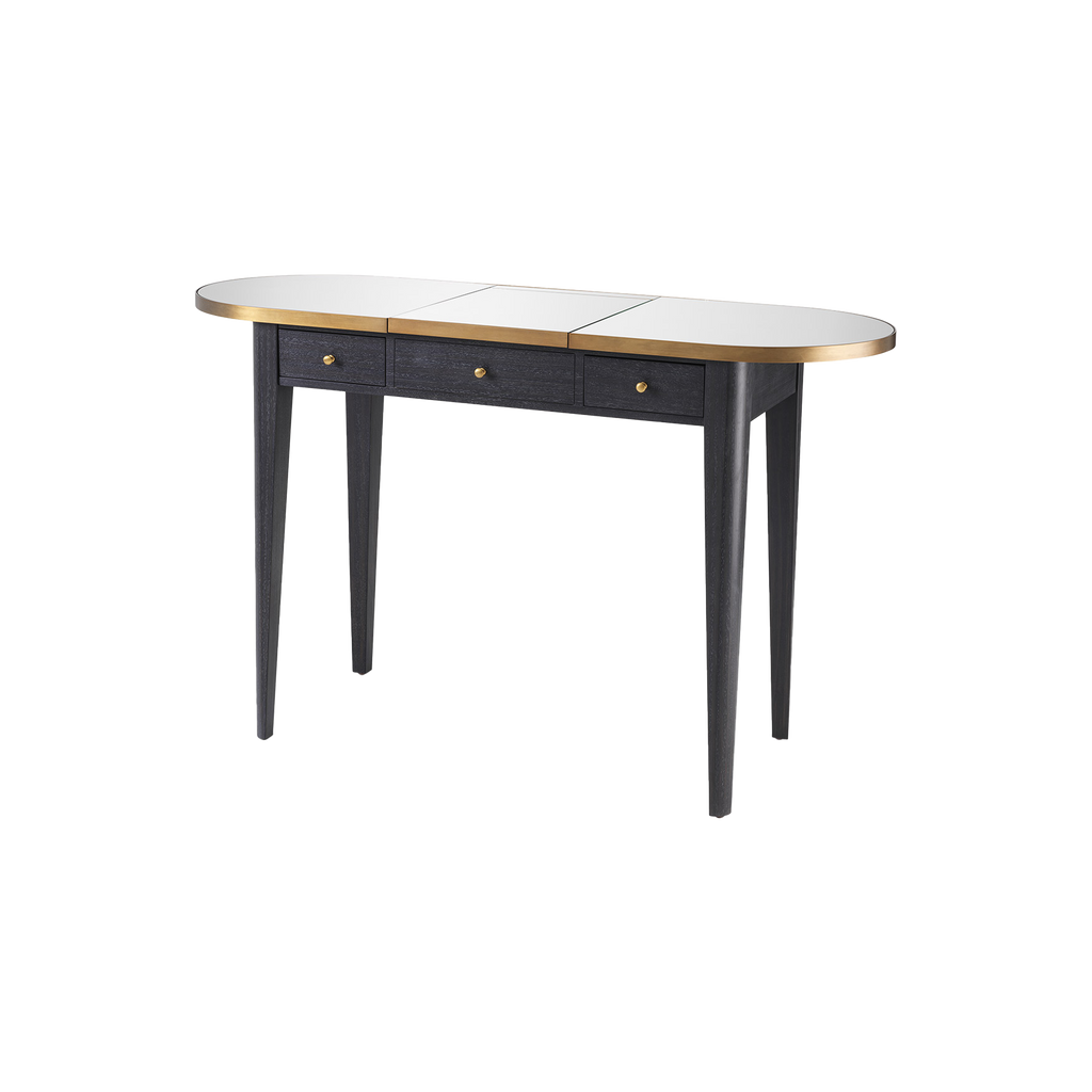 Con el tocador Toulouse tendrás tus accesorios de maquillaje bien organizados en 2 grandes cajones. Su diseño abatible te permite convertir fácilmente este tocador con espejo en un escritorio ideal con espacio de almacenamiento oculto debajo de la tapa. Acabado en chapa de roble antracita, sostiene un tablero de cristal espejo con esquinas redondeadas. El borde y los herrajes con un acabado de bronce cepillado le dan a esta mesa un prestigio adicional.
