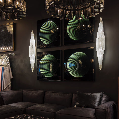 El hipnótico y cautivador arte de la pared Void se inspira en los espejos retro infinitos y el concepto de geometría inversa. El exterior negro brillante está hecho de vidrio reflectante, proporcionando un telón de fondo espectacular para un túnel interminable de anillos de neón que desaparecen en la distancia.