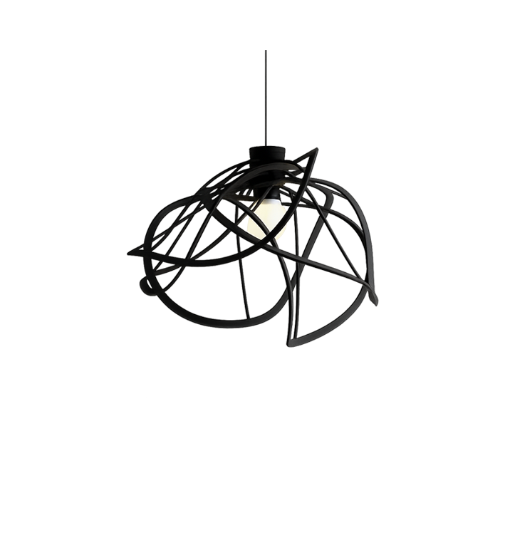 Lámpara de diseño minimalista y versátil. Está suspendida por un sutil cable, sobre el cual reposan las espumas de formas elípticas permitiendo así mayor dinámica en su diseño.