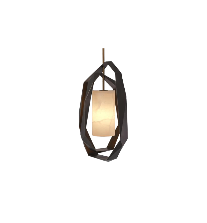 Las formas recortadas de la lámpra de araña Santos Double crean una silueta moderna que se adapta a cualquier dormitorio, sala de estar, comedor o incluso pasillo. El interior tiene un acabado de latón antiguo que adquiere un brillo agradable cuando la lámpara esta encendida. La pantalla tubular está hecha de alabastro translúcido.