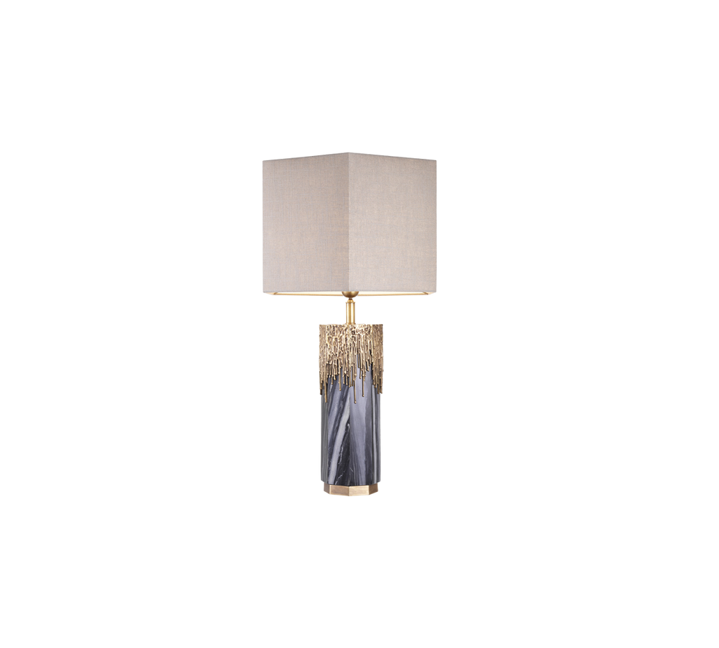 Con forma de prisma decagonal, su cuerpo de mármol gris está adornado con un borde de metal goteante con un acabado de bronce vintage. El impresionante diseño está rematado con una pantalla de mezcla de lino hexagonal.