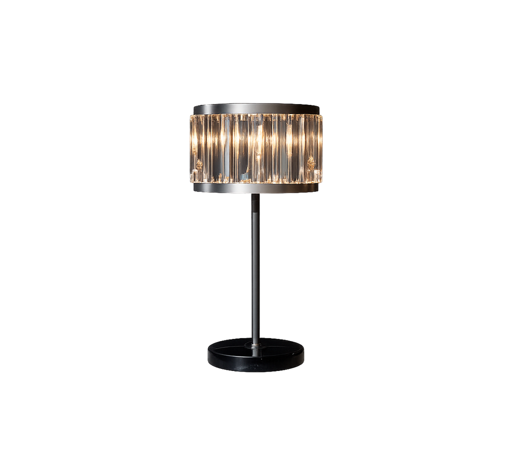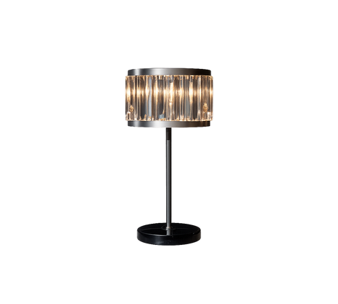 La lámpara de mesa Rex yuxtapone su marco de hierro en bruto con prismas brillantes de vidrio de calidad óptica, refractando la luz en una danza perpetua de brillo y brillo. Glamour vintage, renovado para hoy.