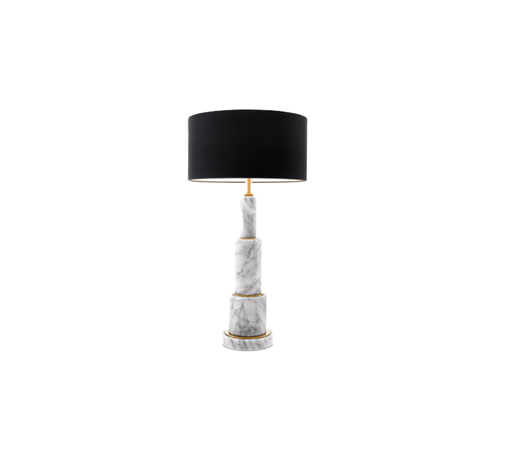 Maravillosa base de mármol blanco y detalles en acabado dorado, esta impresionante lámpara agrega glamour a una variedad de espacios. Con su elegante pantalla de terciopelo negro, llamará la atención en una mesita de noche, una mesa auxiliar o una consola.