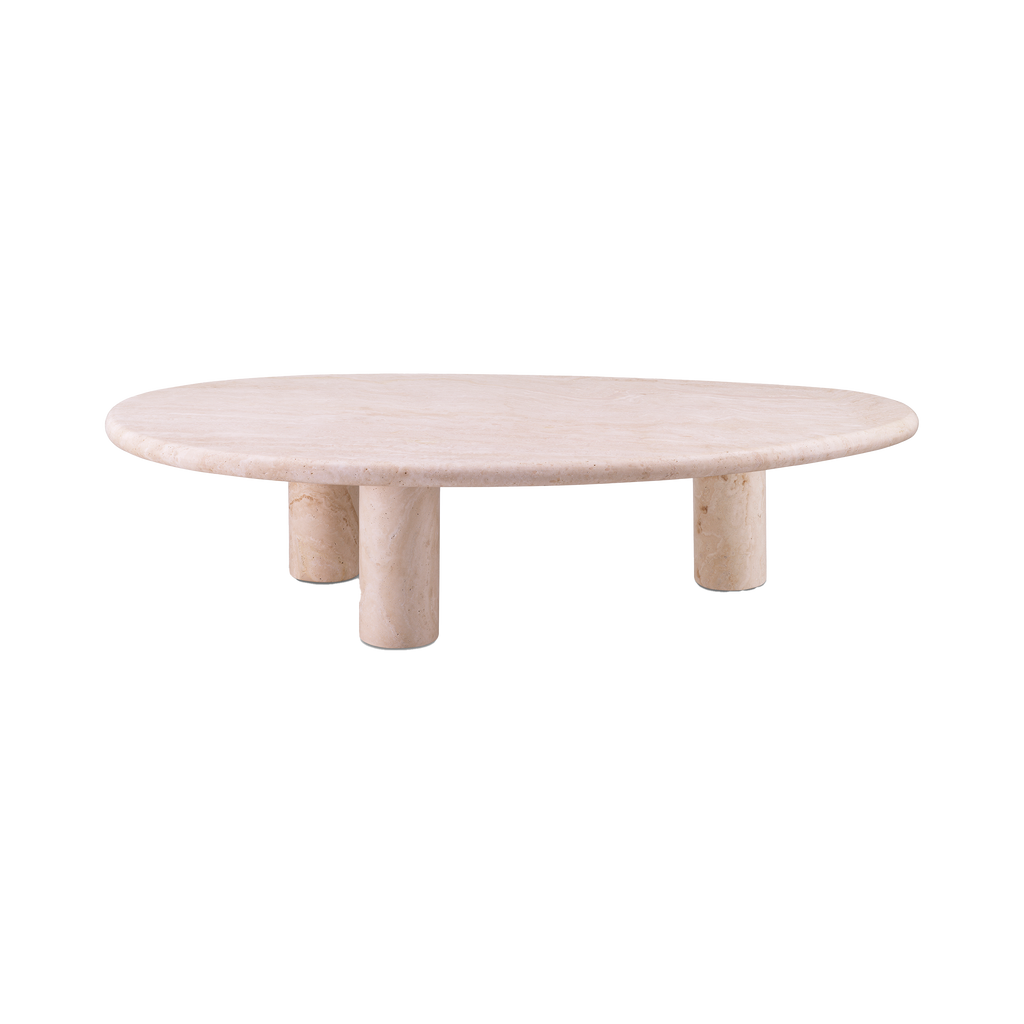 La forma libre de la mesa de café Prelude agrega un elemento de arte orgánico a su espacio vital. Sus suaves curvas y bordes ondulados crean un equilibrio armonioso entre naturaleza y diseño. La superficie de travertino está pulida con maestría para resaltar sus texturas inherentes, acentuando los intrincados patrones únicos que hacen que cada pieza sea verdaderamente extraordinaria.