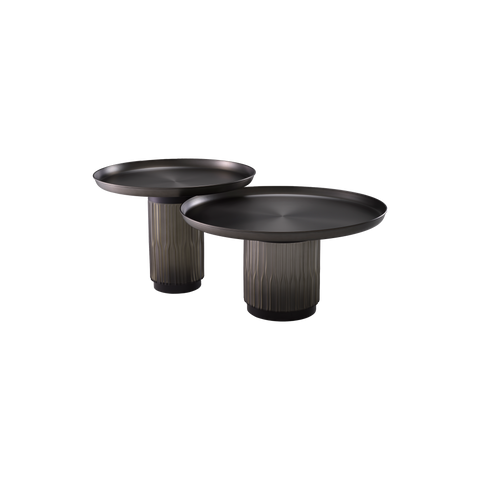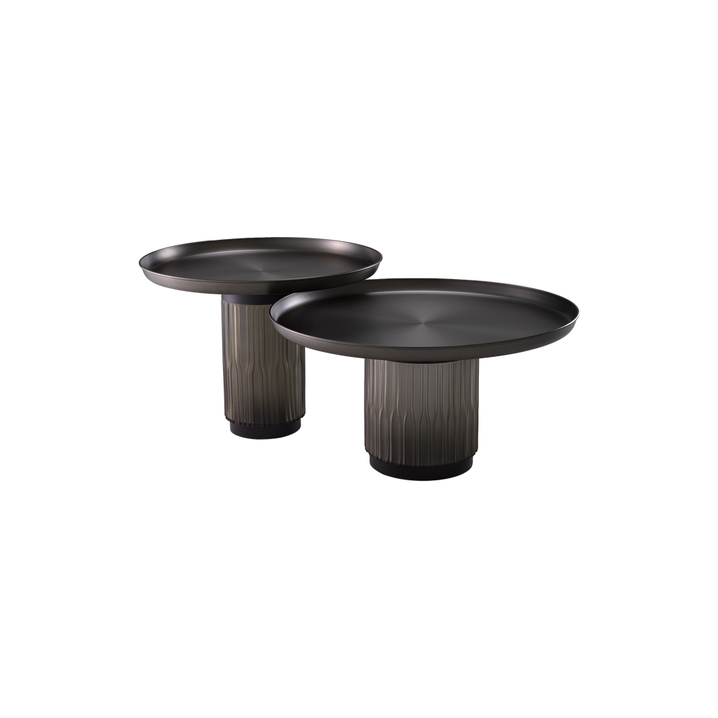 La mesa de centro Zachary se compone de dos preciosas mesas nido. Cada mesa cuenta con un tablero redondo con acabado en bronce y borde elevado, y una base cilíndrica de vidrio esmerilado adornada con un sencillo relieve. Este versátil juego de mesas de centro será un complemento perfecto para cualquier sala de estar o salón.