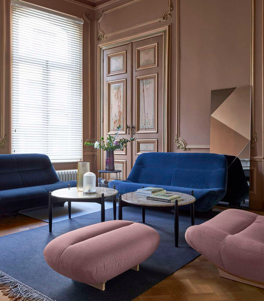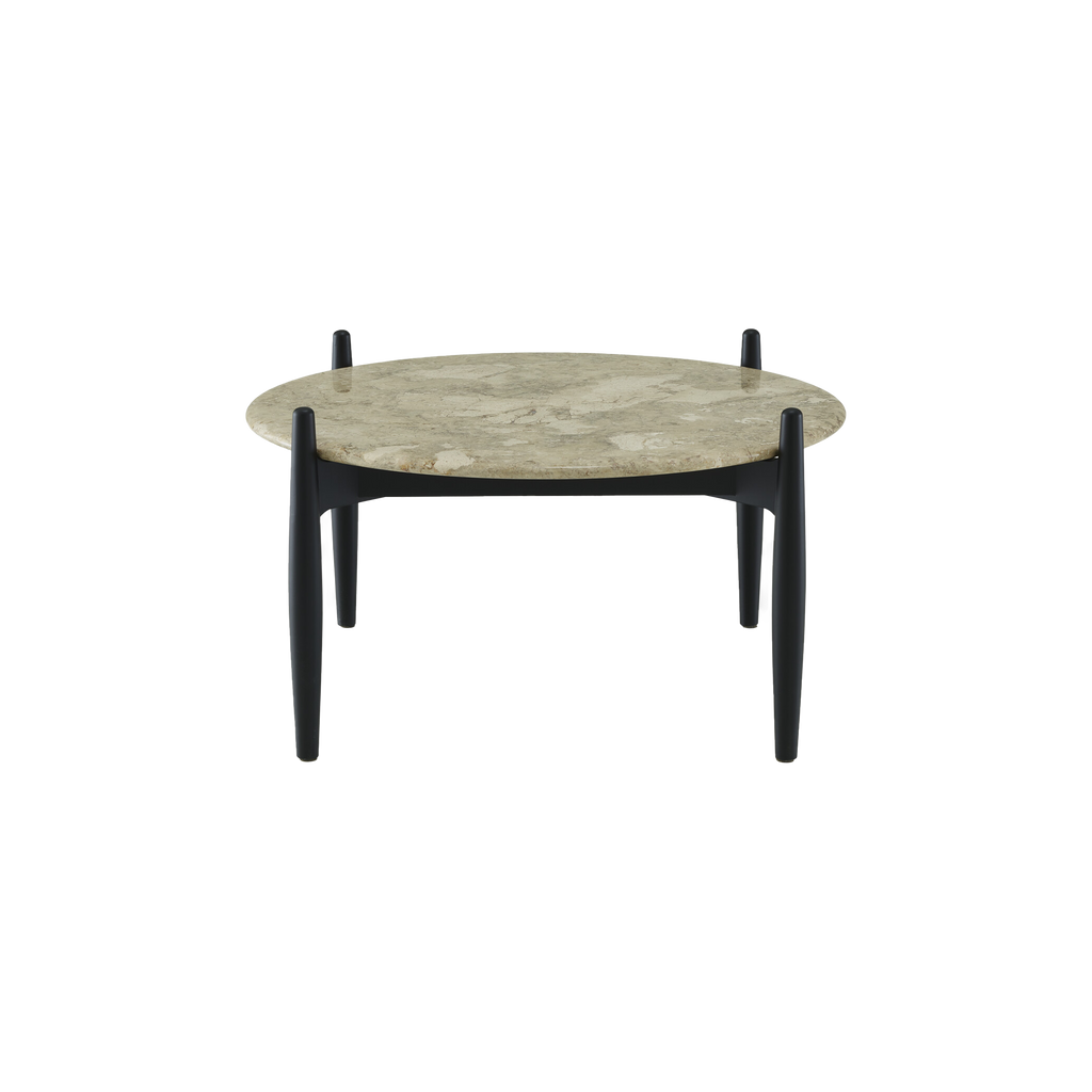 Mesa de centro compuesta por patas de haya maciza lacada en negro satinado y por un tablero de mármol pulido brillante color LATTE (Brecha maritima) tratado contra las manchas, con borde redondeado. El diámetro indicado más arriba corresponde a las medidas totales de la mesa. El tablero solo tiene 90 cm de diámetro y 2 cm de espesor.
