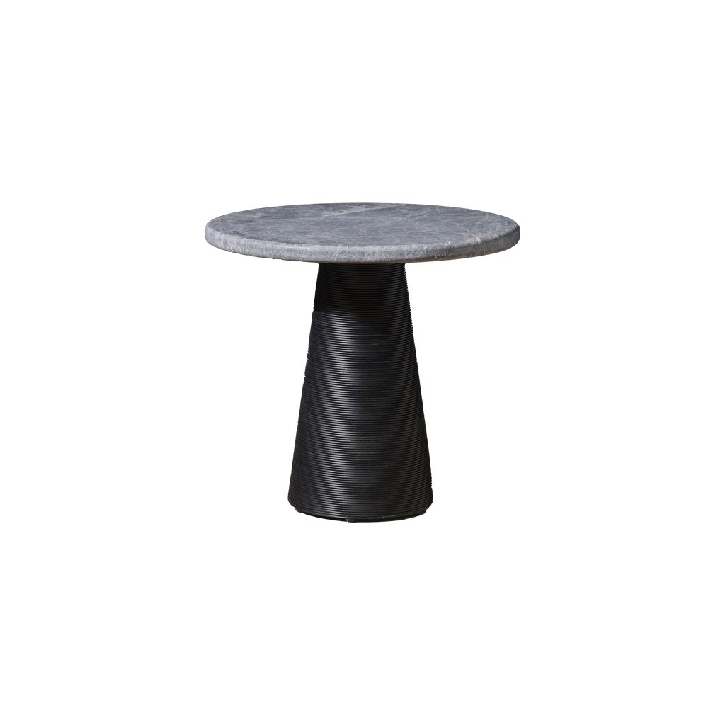 Una nueva versión de una mesa de pedestal clásica. La base cónica está revestida con cordones de cuero, elaborados con nuestro característico cuero acabado a mano, para lograr un fascinante contraste de texturas. Se requieren 180 metros de encaje para crear la mesa de comedor, equivalentes a la altura del famoso edificio Gherkin de Londres, y 80 metros para la mesa auxiliar. El tablero está disponible en cuero o mármol, pulido repetidamente para lograr una auténtica pátina natural.