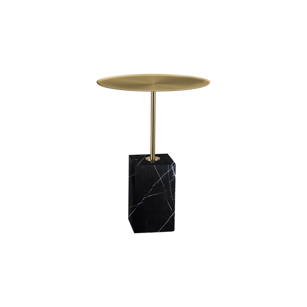 La mesa auxiliar Cole es sinónimo de simplicidad y atractivo natural. El tablero redondo de latón cepillado está adornado con bordes elevados. Se asienta sobre un elegante pie que reposa firmemente sobre un bloque de mármol negro con vetas blancas, lo que le confiere un aspecto elegante y sofisticado.