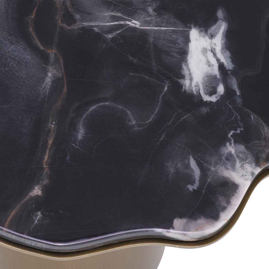 Sumérjase en el ambiente lujoso que la mesa auxiliar Shapiro aporta a su espacio vital. Su cautivadora presencia emana lujo y sofisticación, luciendo una excepcional cubierta de mármol que se funde con gracia con sus singulares patrones y vetas. Su forma libre añade un toque de expresión artística, elevándola a la categoría de una extraordinaria obra de arte funcional. El acabado de latón cepillado de la base irradia opulencia, complementando a la perfección el encanto del mármol.