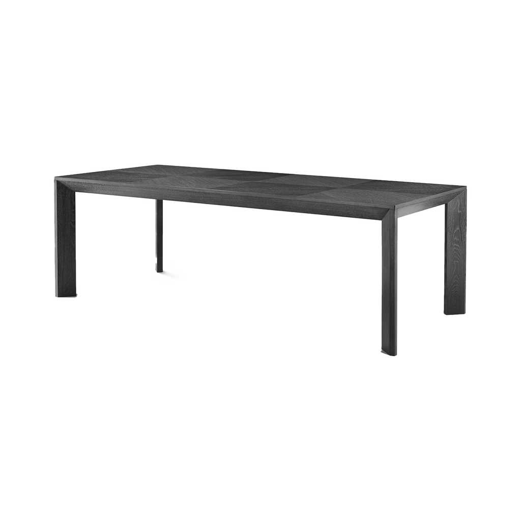 Con su tablero de chapa de roble negro a poro abierto, la mesa de comedor Tremont se adapta igualmente a los esquemas interiores rústicos y urbanos modernos. Su diseño elegante y exclusivo se ve realzado por las patas colocadas en diagonal.