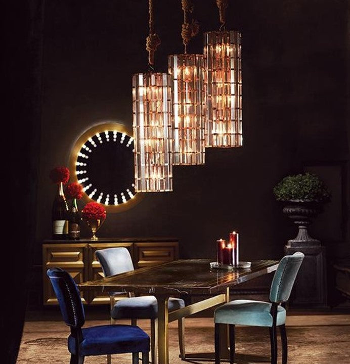 Alta, esbelta y glamorosa, la colección Night Rod ofrece iluminación espectacular para espacios elegantes. Los prismas largos de vidrio de grado óptico se mantienen juntos creando un efecto escalonado, dentro de un esqueleto de bronce natural. La forma triangular de los prismas refleja y refracta la luz en todos los lados en una brillante danza de brillo.